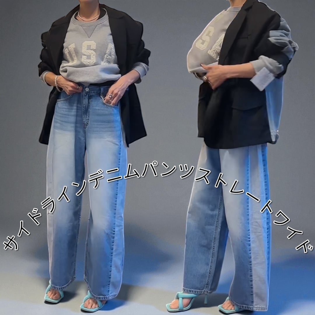 サイドラインですっきり見えのワイドストレートデニムパンツ